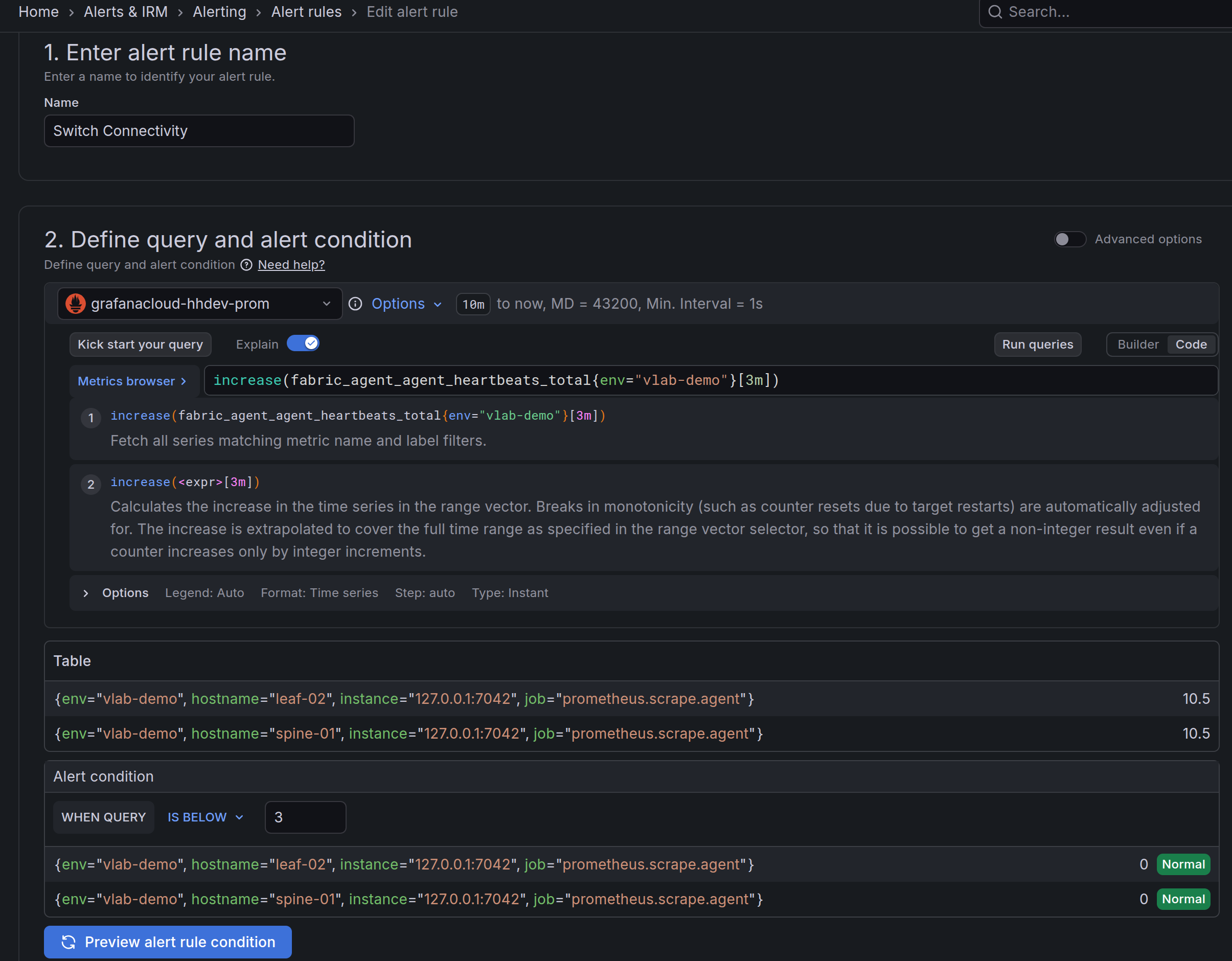 The alert rule queries the increase of the
